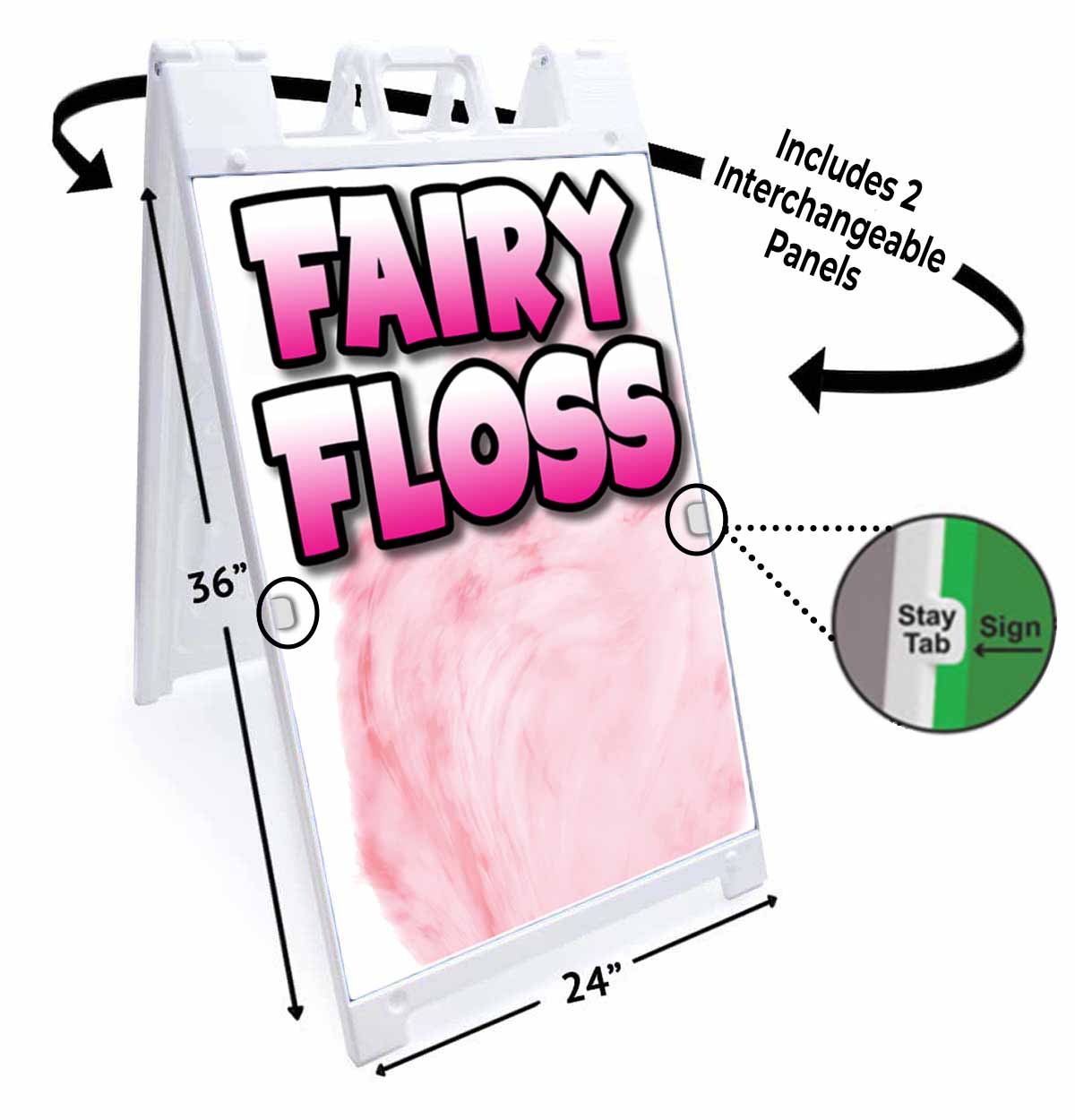 The Fairy Floss A-Frame Signs, Decals, or Panels are great advertising tools for your business. Studies show that A-Frame Signs, Decals, and Panels draw more notice than many other advertising methods. A-Frame Signs, Decals, and Panels are a price effective ways to grab attention and raise awareness for your business.