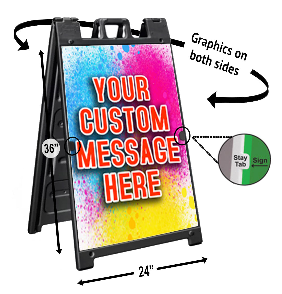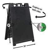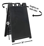 We offer 2 unique versions of the black heavy-duty A-Frame Sign. The Standard version includes the plastic A-Frame stand with 2 decals applied directly onto both sides. The Deluxe version includes the plastic A-Frame stand with the graphic decals applied to two 24" wide by 36" tall, single-sided corrugated plastic panels that can then slide onto the Stand and hold in place by Stay Tabs that are a part of the Stand. The graphics are all digitally printed on UV and water resistant, heavy-duty vinyl.