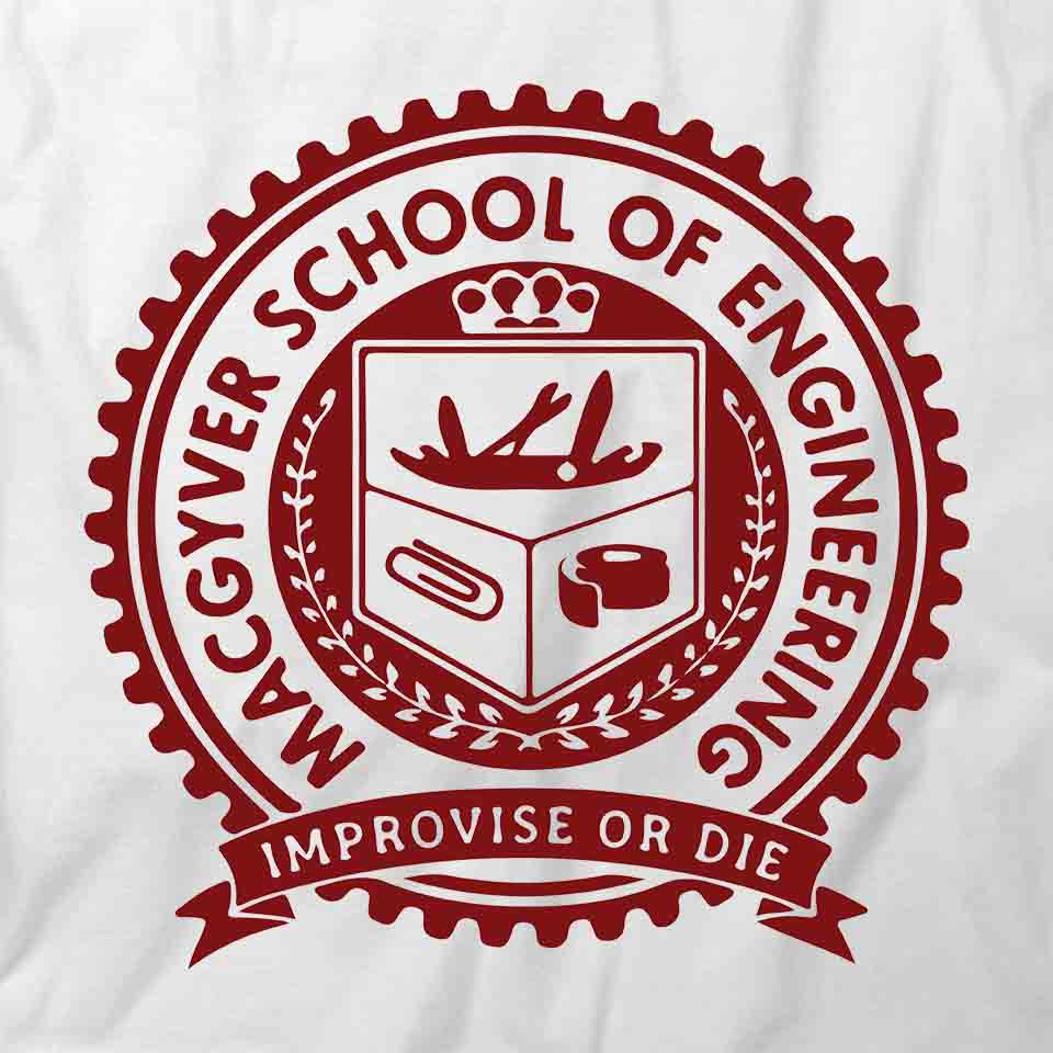 The Macgyver School of Engineering T-Shirt is a great conversation starter. Our Macgyver School of Engineering T-Shirt is soft, comfortable, and stylish. And the design is crisp, clear, and durable.