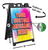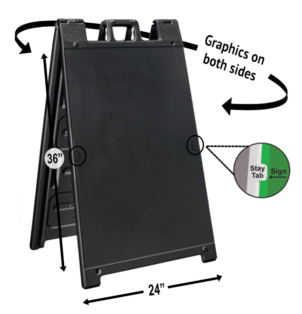 We offer 2 unique versions of the black heavy-duty A-Frame Sign. The Standard version includes the plastic A-Frame stand with 2 decals applied directly onto both sides. The Deluxe version includes the plastic A-Frame stand with the graphic decals applied to two 24" wide by 36" tall, single-sided corrugated plastic panels that can then slide onto the Stand and hold in place by Stay Tabs that are a part of the Stand. The graphics are all digitally printed on UV and water resistant, heavy-duty vinyl.