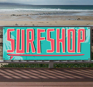 The Surf Shop Banner is a great advertising tool for your business. Studies show that Banners draw more notice than many other advertising methods. Banners are a price effective way to grab attention and raise awareness for your business.